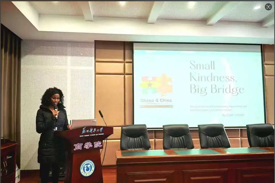 来自加纳的硕士生Edith,以全英文演讲《Small Kindnesses, Big Bridge》温暖了全场。她分享了在中国因奶茶、香味和一次热心打车,而结缘的跨文化故事,生动地证明:“小小的善意,足以搭建起沟通心灵的桥梁”,完美诠释了“语言有界,善意无疆”。