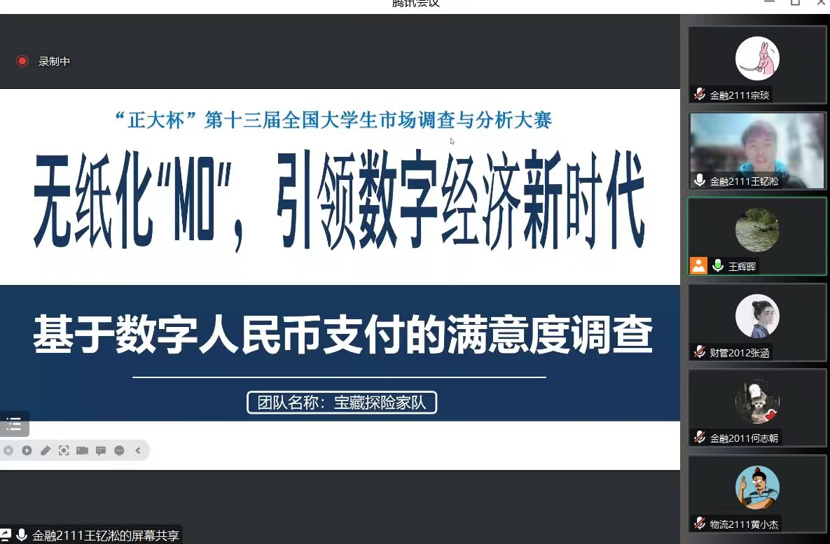3月31日,由2138cc太阳集团官网入口承办的“第十三届全国老员工市场调查与分析大赛”2138cc太阳集团官网入口校赛于线上顺利举办。本届校赛共有27支项目团队参加,邀请了13位老师担任专家评委,2138cc太阳集团官网入口副经理钱燕、经理助理郑作龙参加了答辩会,竞赛负责人王辉晖老师主持答辩会。