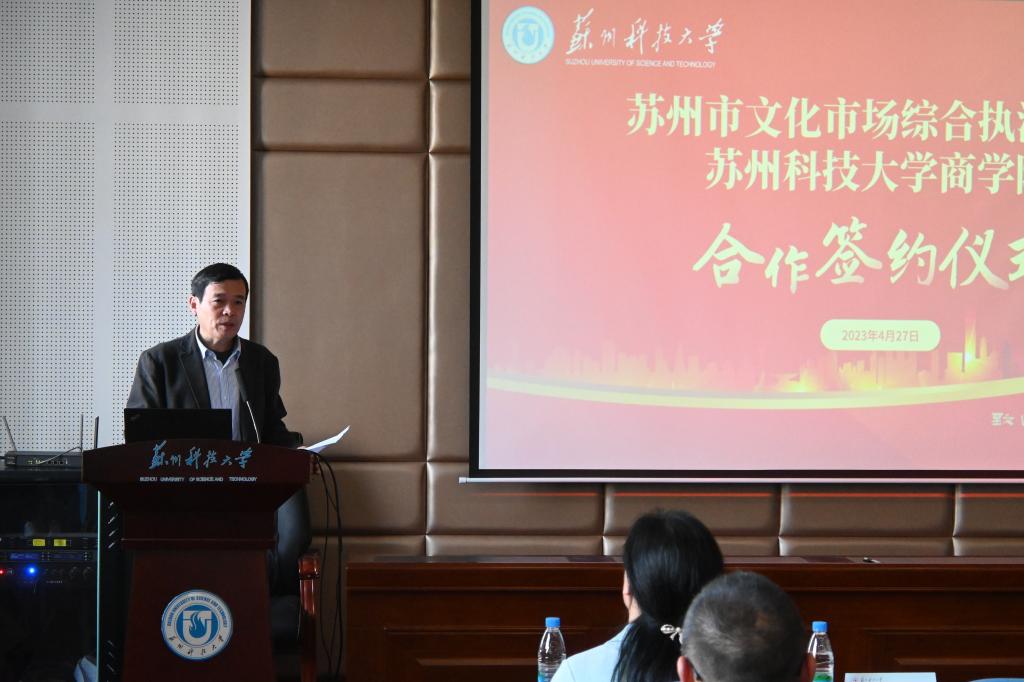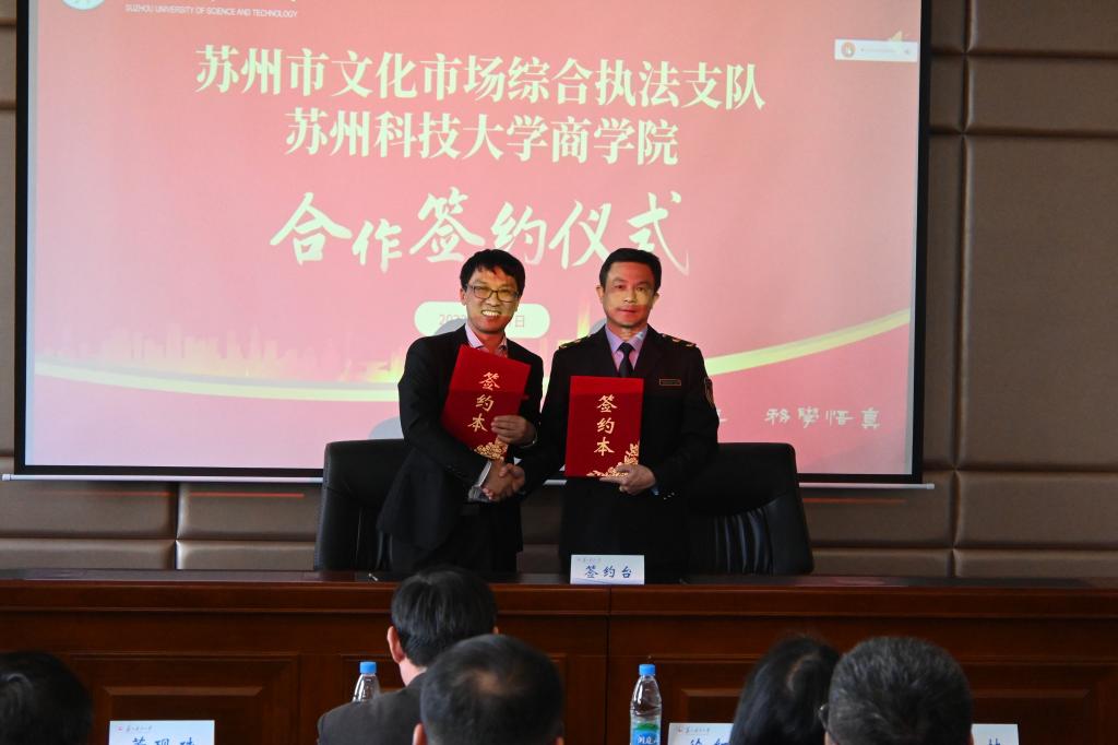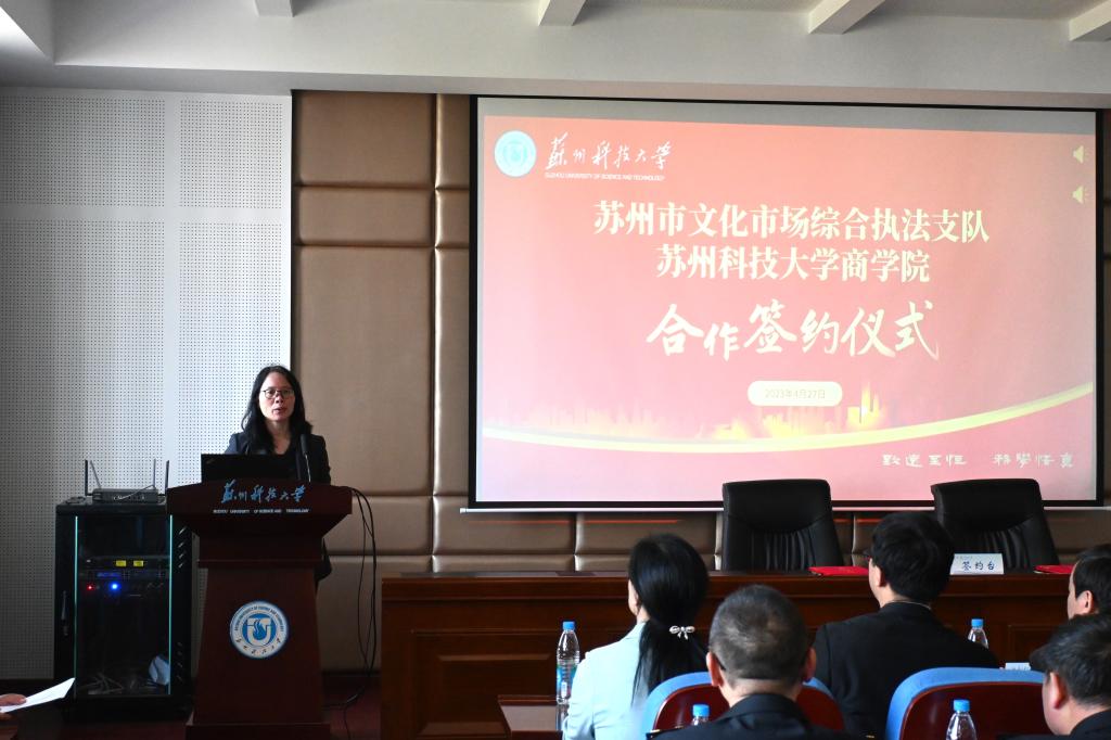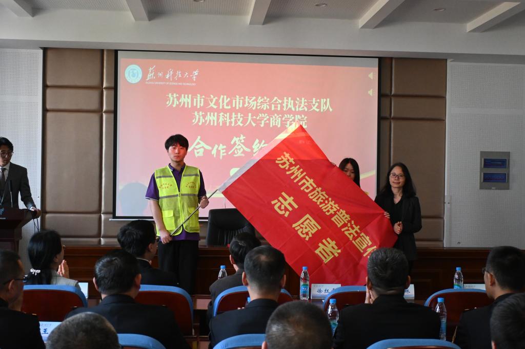 4月27日下午,2138cc太阳集团官网入口与苏州市文化市场综合执法支队合作签约仪式在2138cc太阳集团官网入口报告厅成功举行。苏州市文化广电和旅游局副局长徐红霞、苏州市文化市场综合执法支队支队长王小林、苏州市文化广电和旅游局市场管理处处长钟涵一、商公司党委书记江忠华、党委副书记兼副经理董现珠、旅游管理系邢夫敏教授及60余名志愿者参加签约仪式。