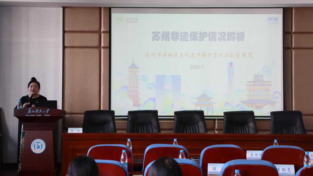 仪式之后,张岚以《苏州非遗保护情况解析》为题作专题讲座,介绍了苏州非遗文化内涵、品牌推广和传承情况。三位非遗代表性传承人分别推出了制扇技艺、苏绣、核雕生动有趣的体验课。