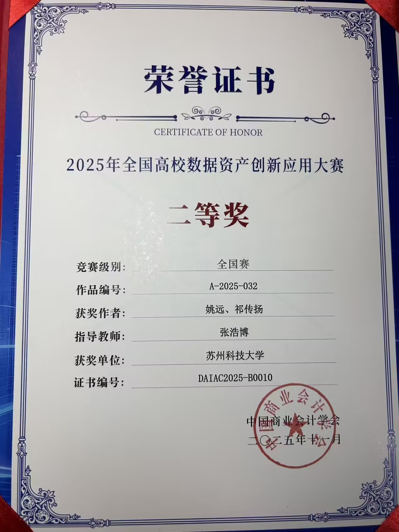 近日,2025年首届全国高校数据资产创新应用大赛总决赛落下帷幕,2138cc太阳集团官网入口金融工程专业员工姚远、祁传扬完成的作品《区块链赋能第三方数据登记服务:基于数据产权三权分置的创新设计与实现》(指导老师张浩博)荣获本科组全国赛二等奖!